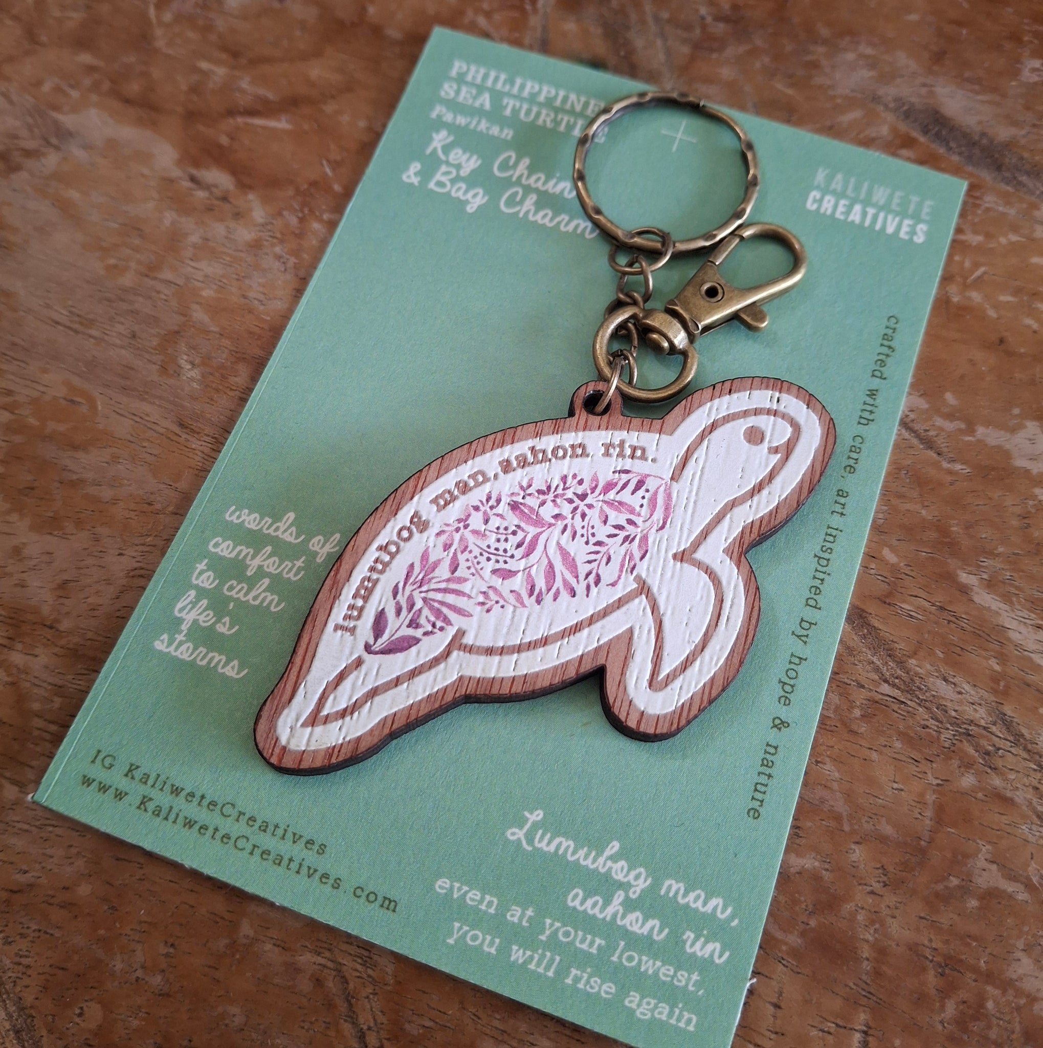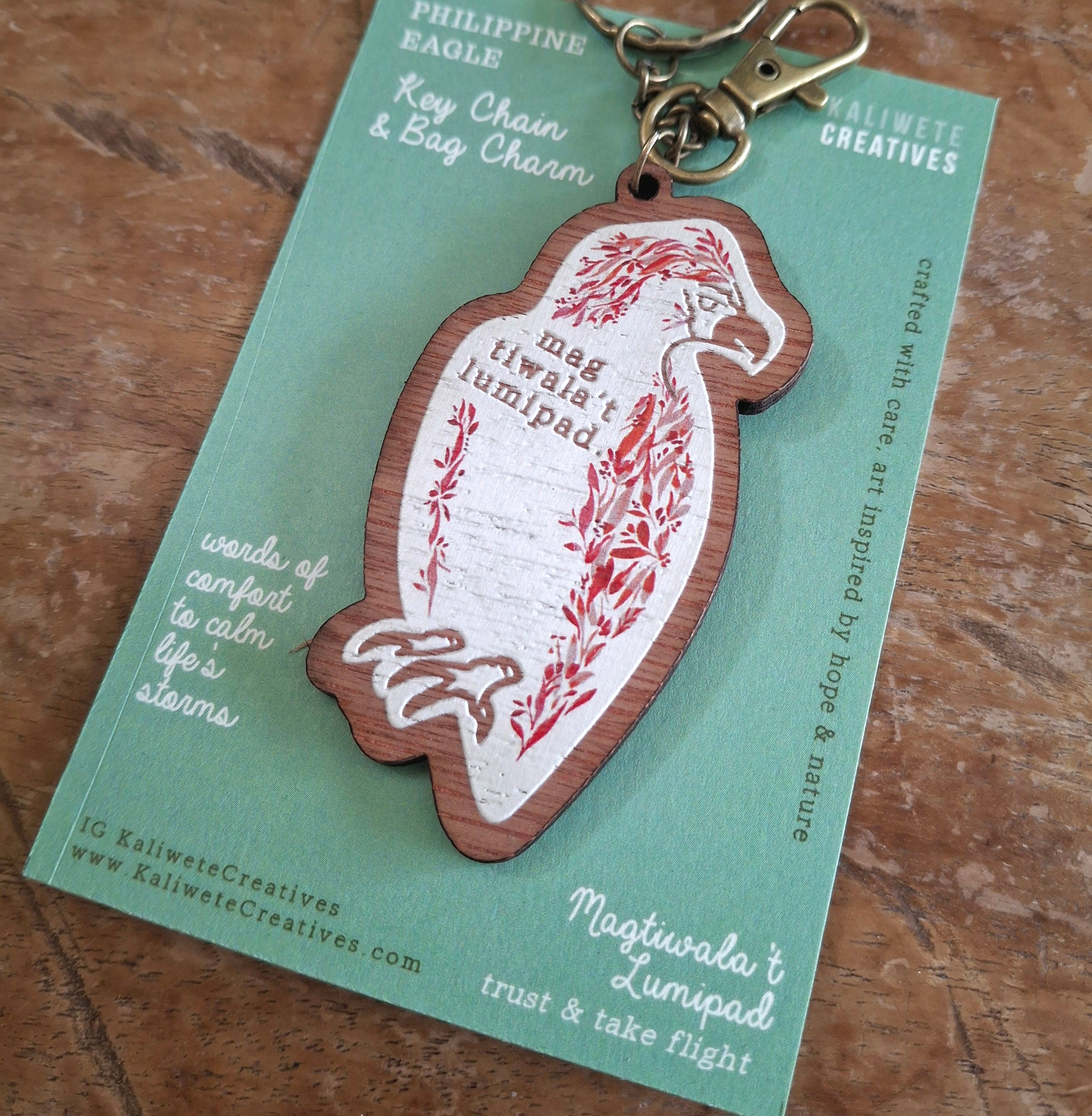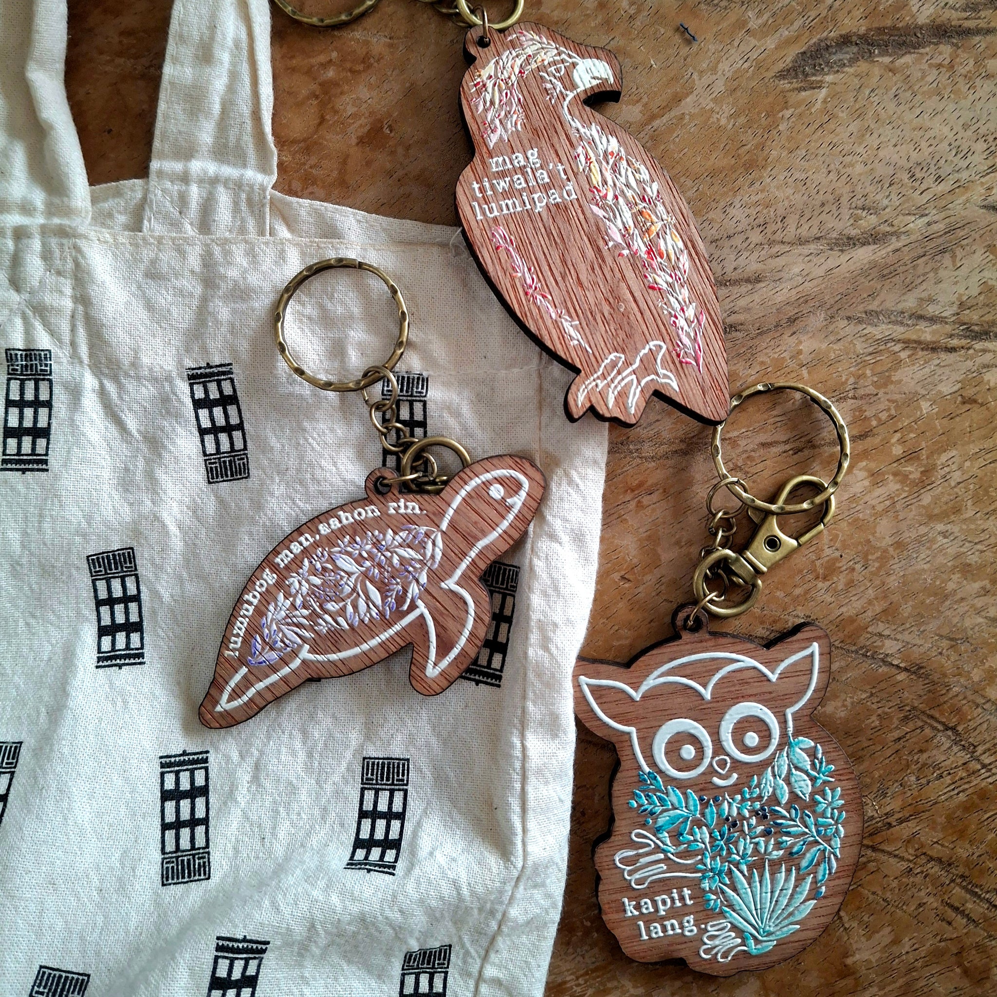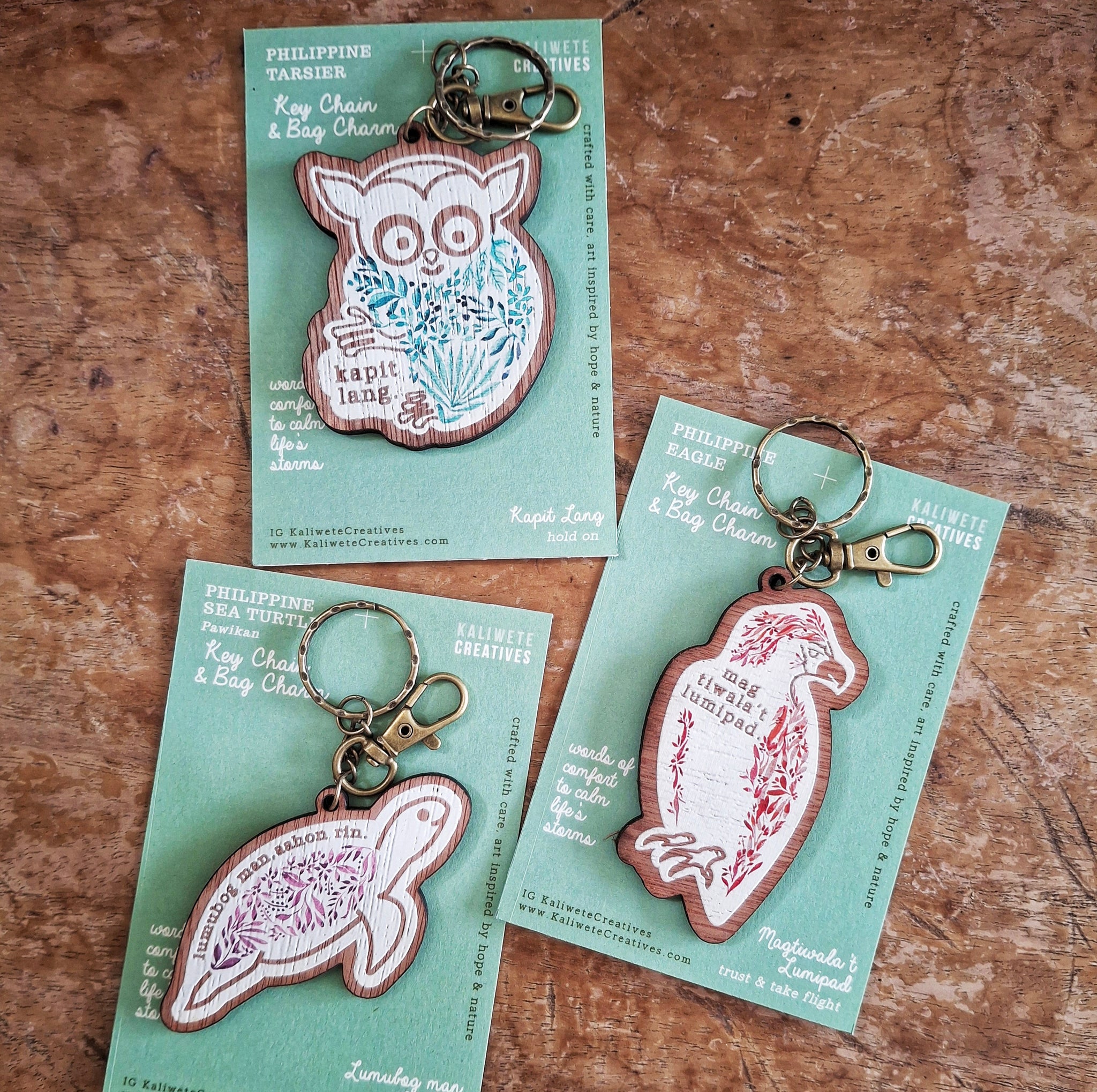 Inspired from the well-loved Bahaghari postcard collection, these rustic wooden bag charms are gentle reminders of hope and strength.
